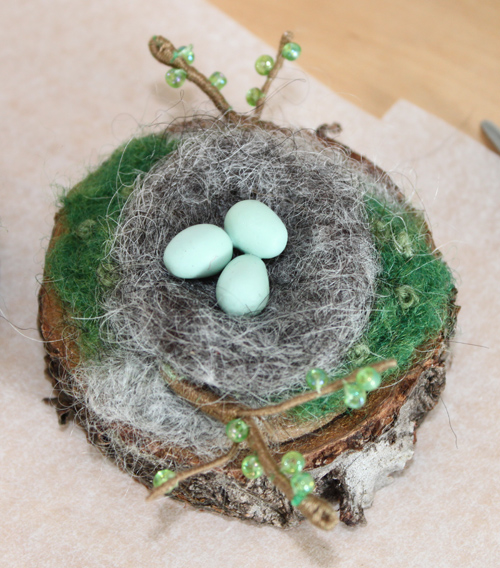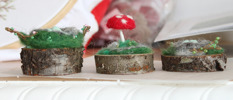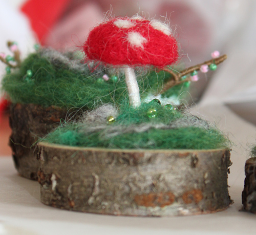 I made 2 nests and 1 mushroom. These are my first little projects with needle felting, but likely not my last! I glued them on to pieces of cherry wood. For the nests I made little branches of wire sticking out from the sides. They look a bit odd in the pictures, but much better in person! The eggs are polymer clay. The mushroom is best in my opinion, and so I think I will make more of them. It was fun to play around a bit!