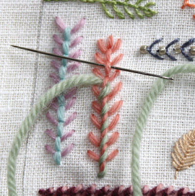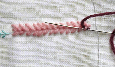 I did something like this for the wheat ear stitch. Basically the fly stitch can be whipped, threaded and wrapped in many different ways. For varation 5, after making the basic line of stitches, bring up your needle with a second thread, and wrap it around each stitch on both sides.